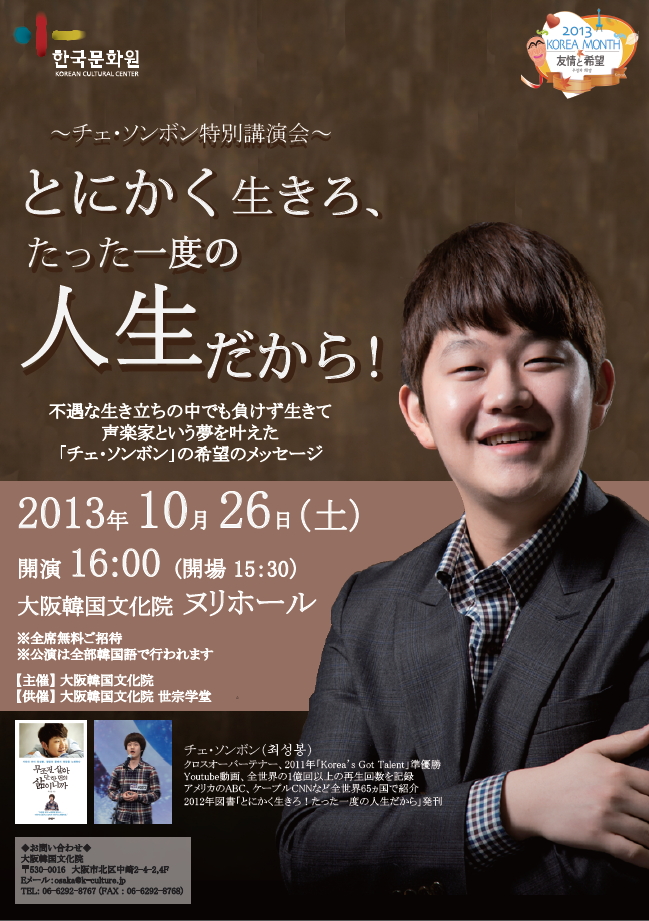 彼にとって唯一の‘希望’であった‘歌’を通じ、希望のメッセージを伝えている韓国のポール・ポッツ(Paul Potts)!チェ・ソンボンさんから生き生きとしたお話を聞かせていただきます。