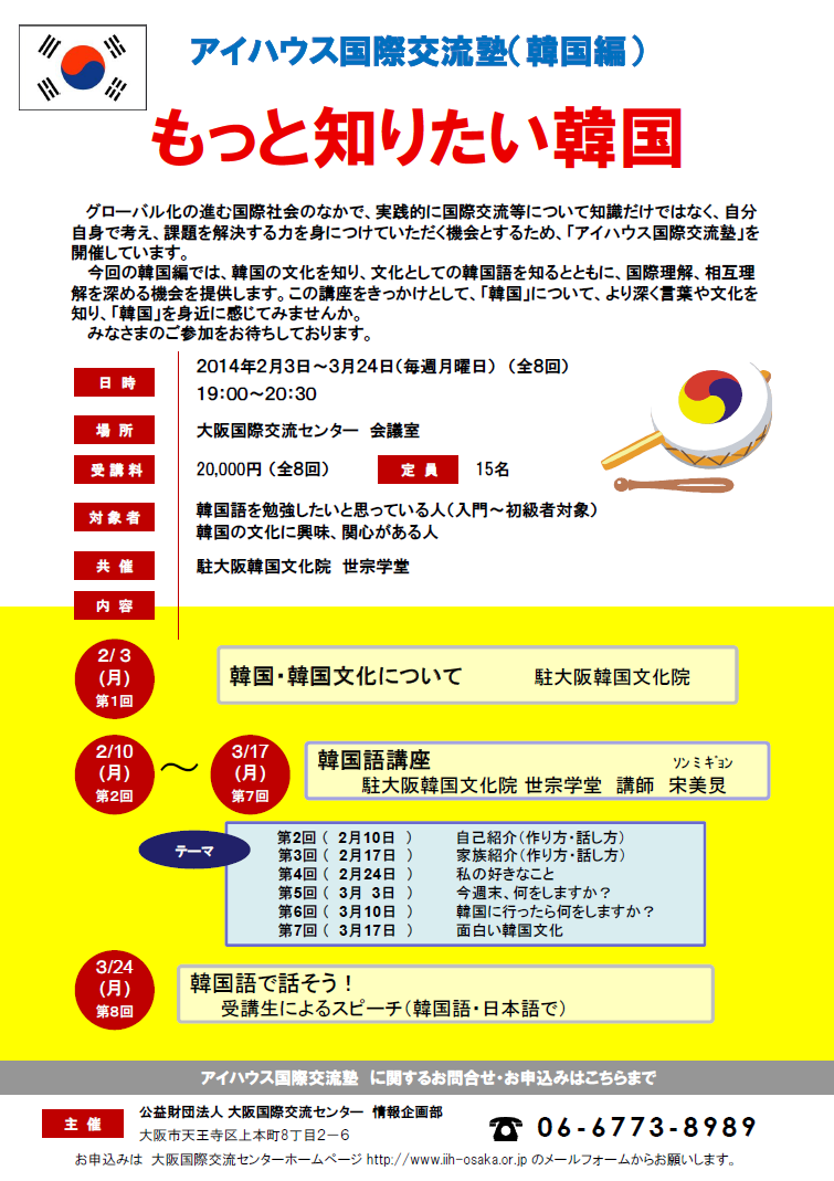 この度「大阪韓国文化院 世宗学堂」と「大阪国際交流センター」は国際交流・協力、多文化共生などの基礎的な知識と、コミュニケーションツールとしての語学を学ぶ場として「アイハウス国際交流塾 韓国編」を開催いたします。