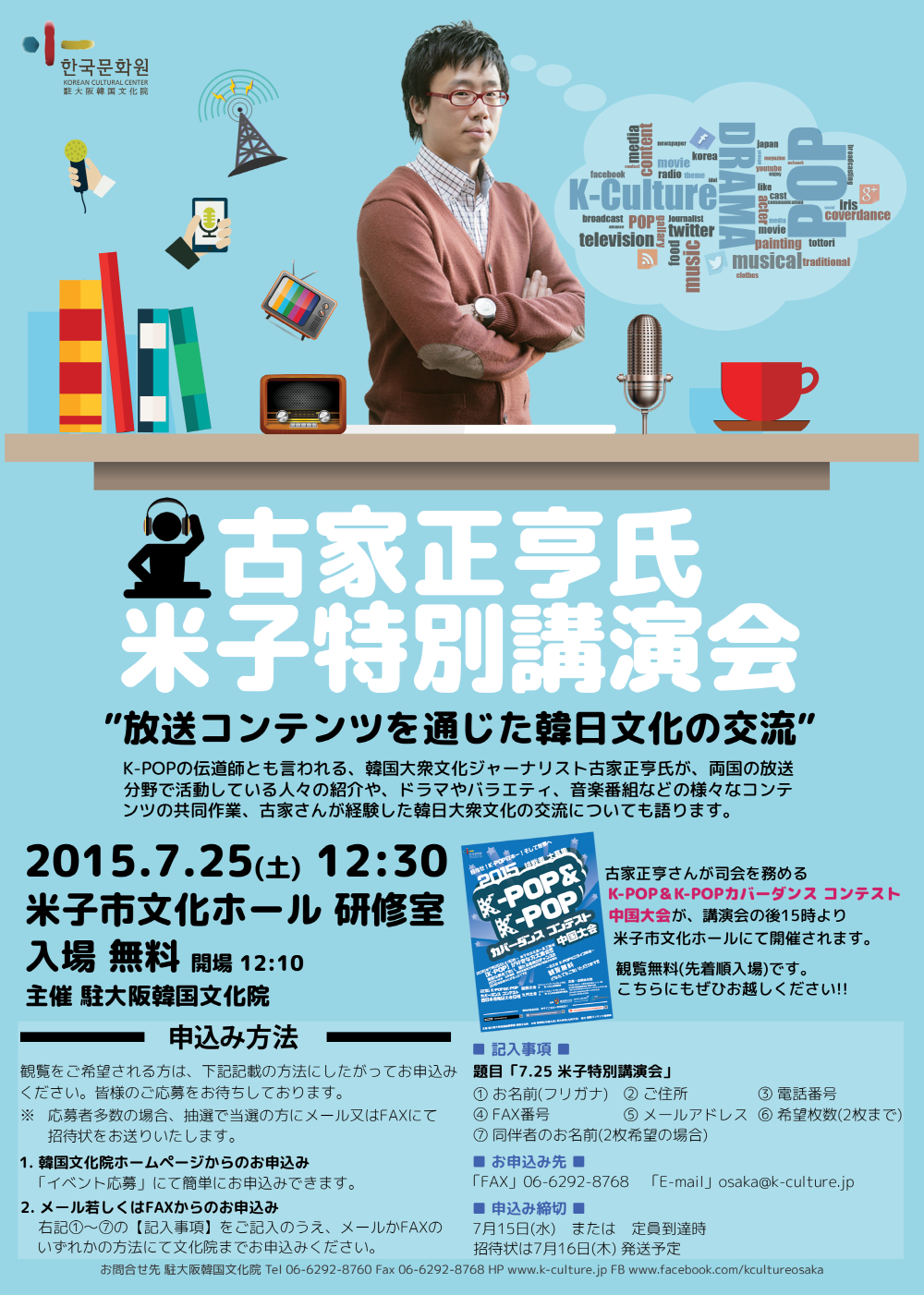 韓国文化院では、“K-POPの伝道師”として知られる古家正亨さんの特別講演会を鳥取県米子市にて開催します。