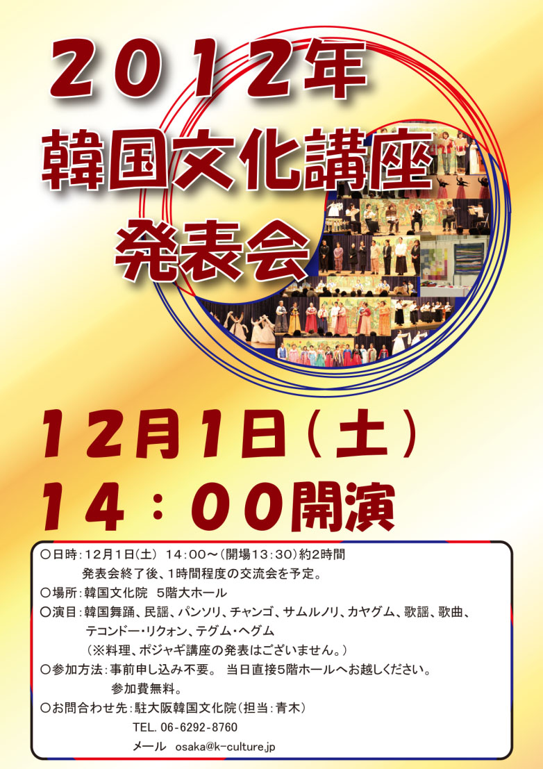 このたび、今年も12月1日(土)14:00より韓国文化院・5階大ホールにて 「2012年 韓国文化講座発表会」を開催いたします。