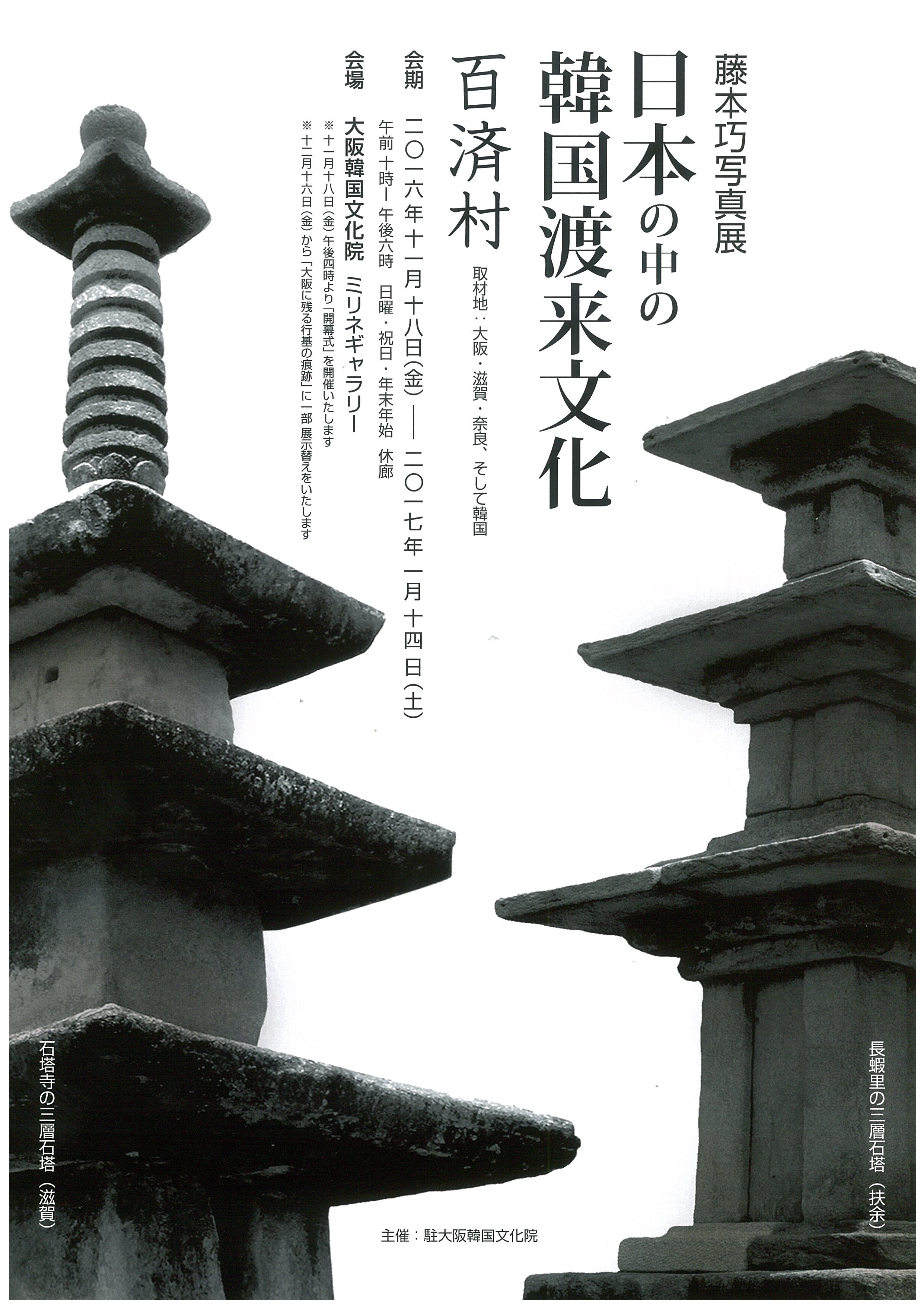 大阪韓国文化院では、関西地域、特に大阪、滋賀、奈良などに残る「韓国渡来文化」ゆかりの史跡を、藤本巧 写真作家の作品で紹介する「日本の中の韓国渡来文化 ~百済村~」を開催いたします。