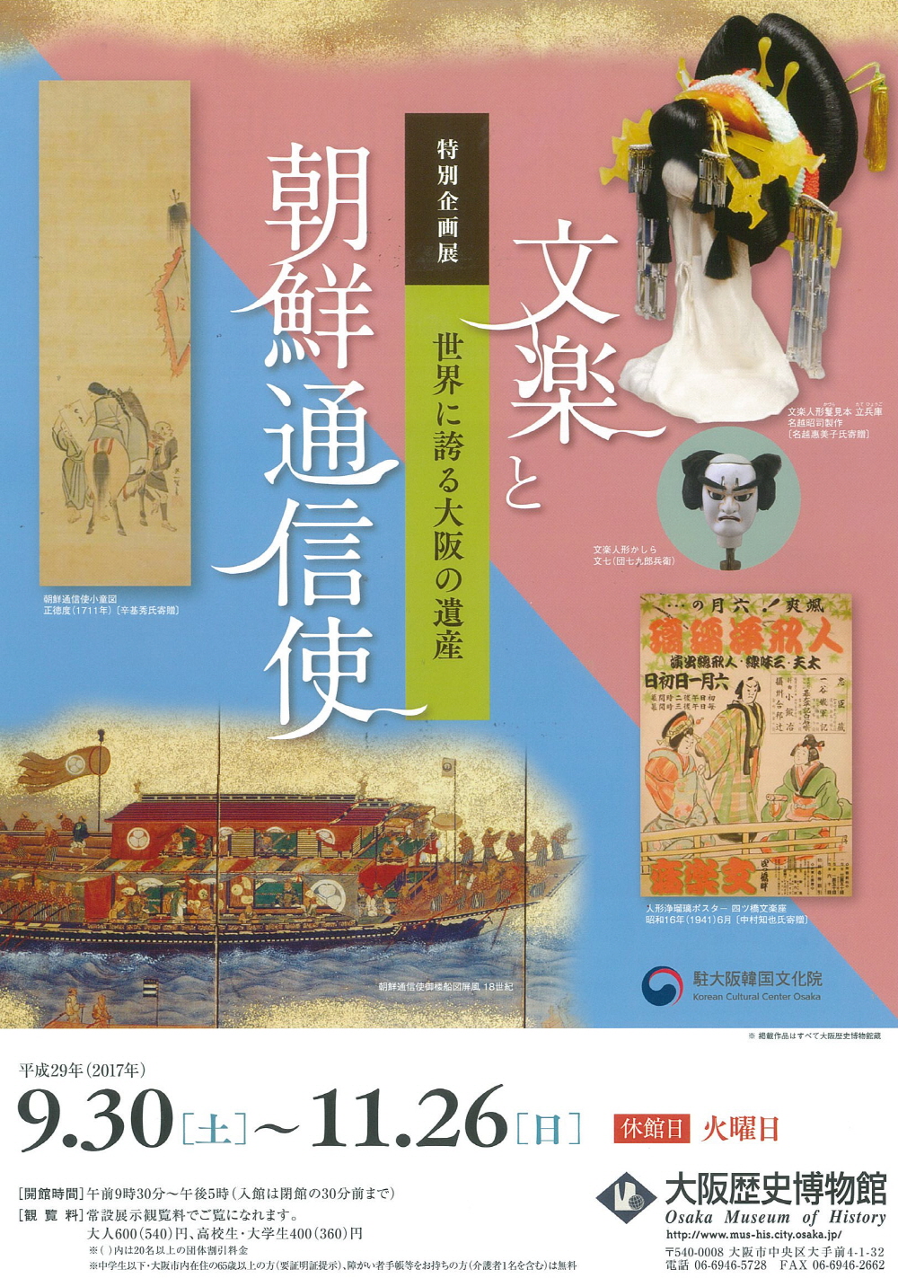 大阪歴史博物館にて、9月30日(土)から11月26日(日)まで、特別企画展「世界に誇る大阪の遺産 ~文楽と朝鮮通信使~」が、大阪韓国文化院の共催により開催されます。