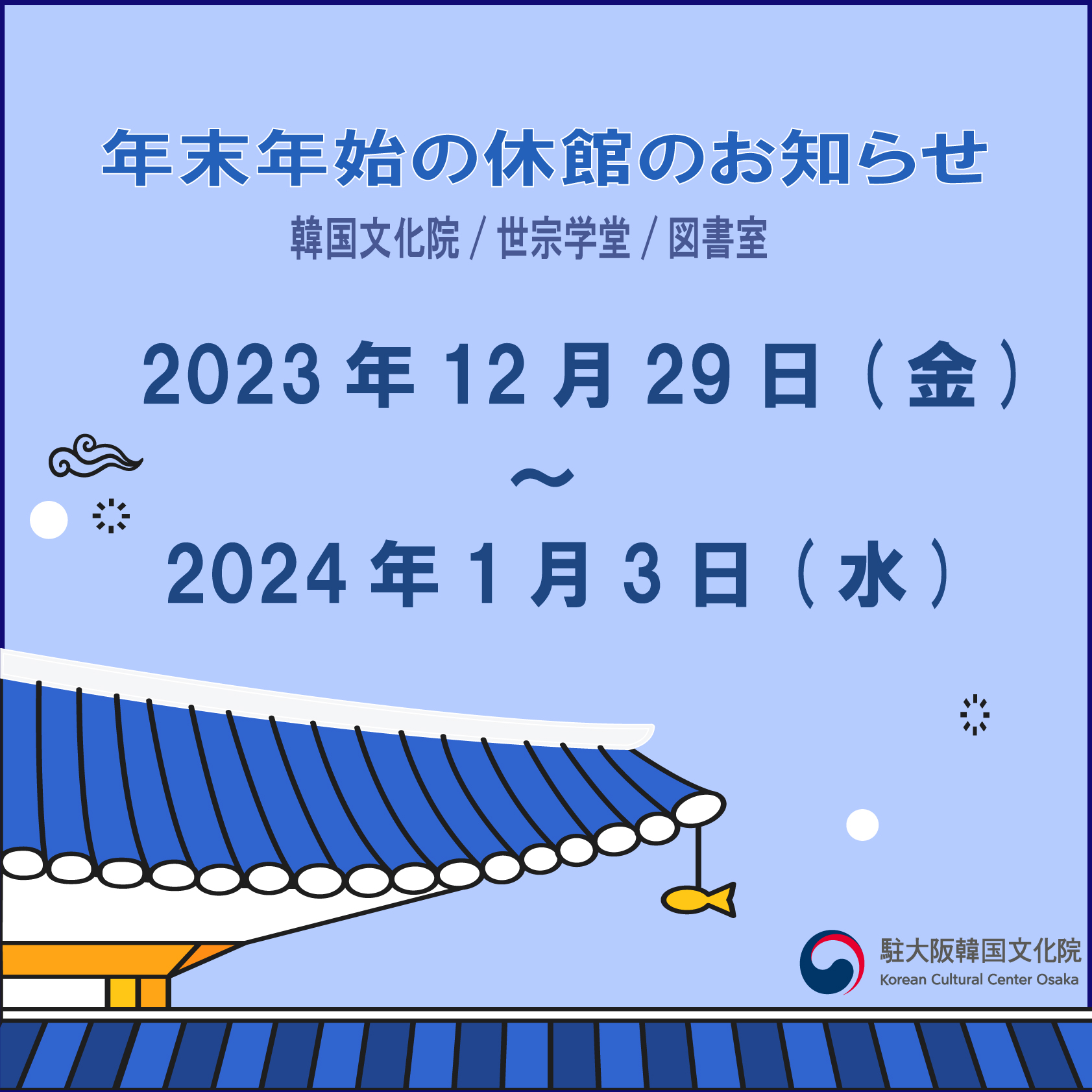 주오사카한국문화원은 2023년~2024년 연말연시 기간 아래와 같이 휴관하오니 참고 부탁드립니다.