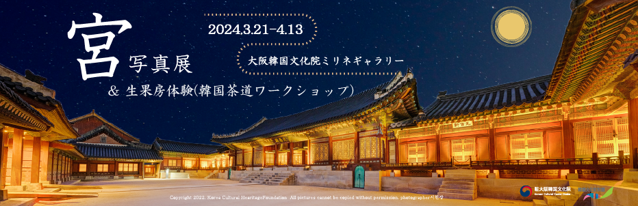 오사카한국문화원에서는 한국문화유산 「궁」의 아름다운 모습을 사진으로 만나볼수 있는 사진전을 개최합니다. 이번 전시는 경복궁, 창덕궁, 창경궁의 아름다운 모습을 담은 사진전시를 메인으로 자신만의 풍속도 만들기, 아름다운 궁에서 펼쳐진 뮤지컬을 관람하실 수 있는 다양한 프로그램이 준비되어 있습니다.