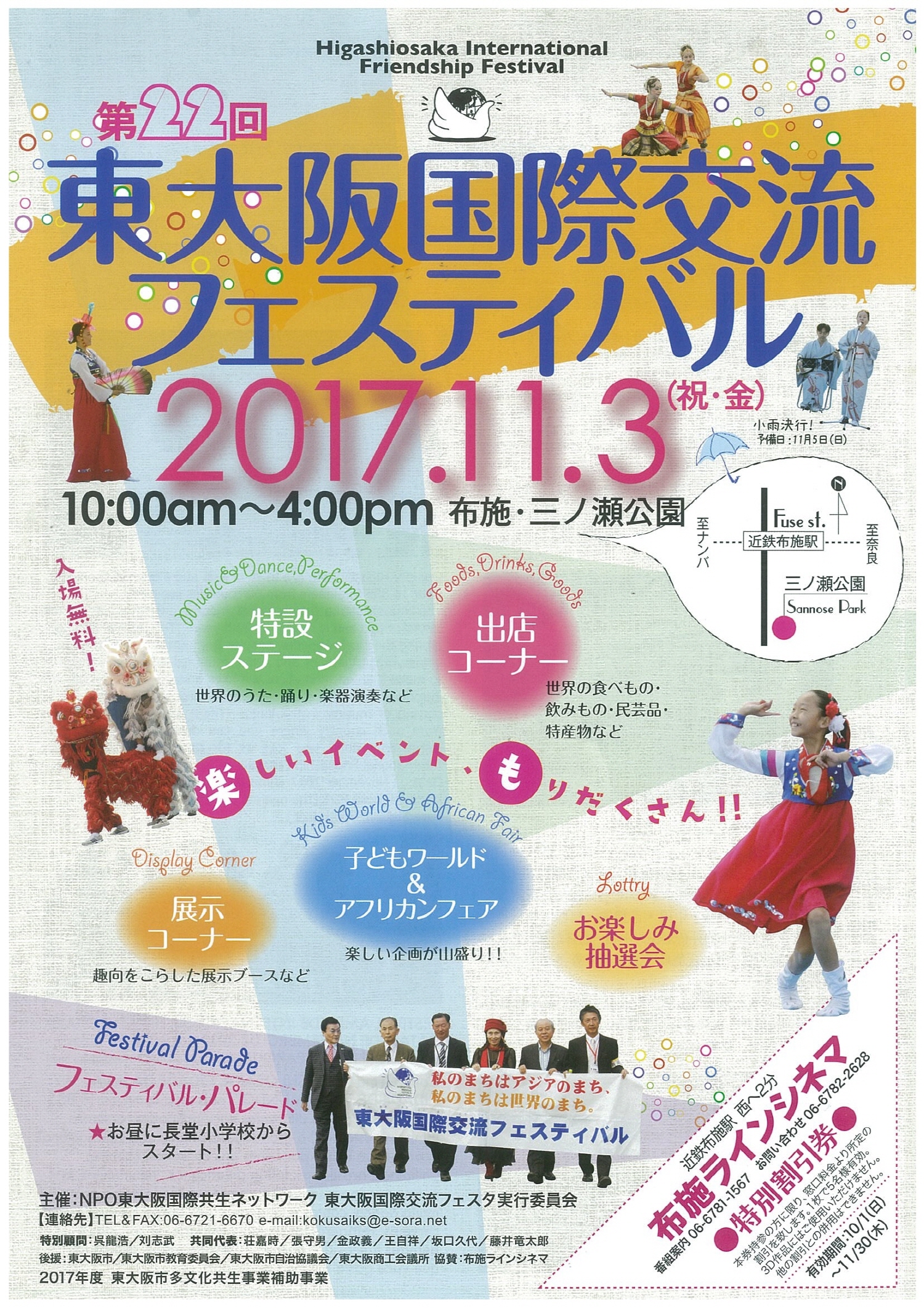 | 主催者 | NPO東大阪国際共生ネットワーク 東大阪国際交流フェスタ実行委員会 | 期間 | 2017-11-03 ~ 2017-11-03 | |