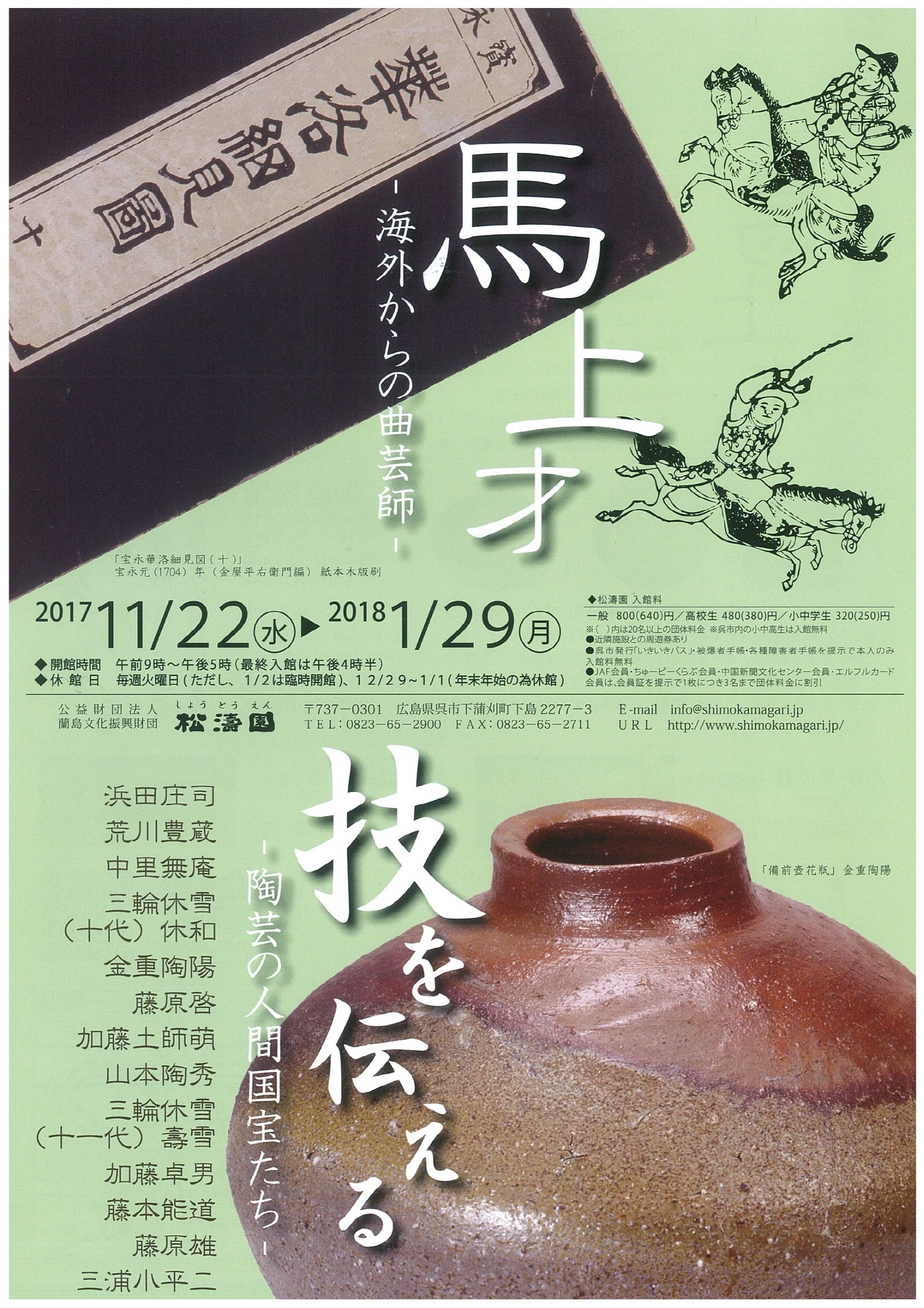 | 主催者 | 公益財団法人 蘭島文化振興財団 松濤園 | 期間 | 2017-11-22 ~ 2018-01-29 | |