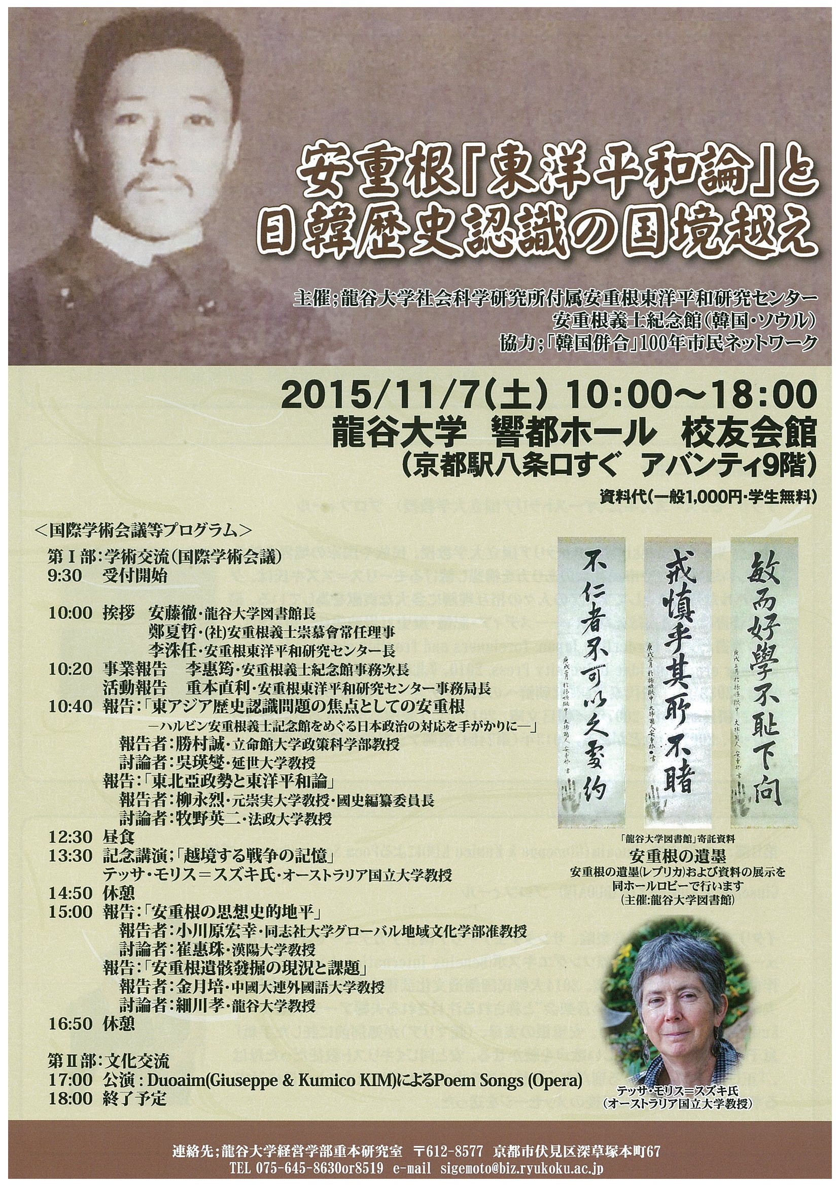 | 主催者 | 龍谷大学社会学研究所付属安重根東洋平和研究センター・安重根義士紀念館(韓国・ソウル) | 期間 | 2015-11-07 ~ 2015-11-07 | |