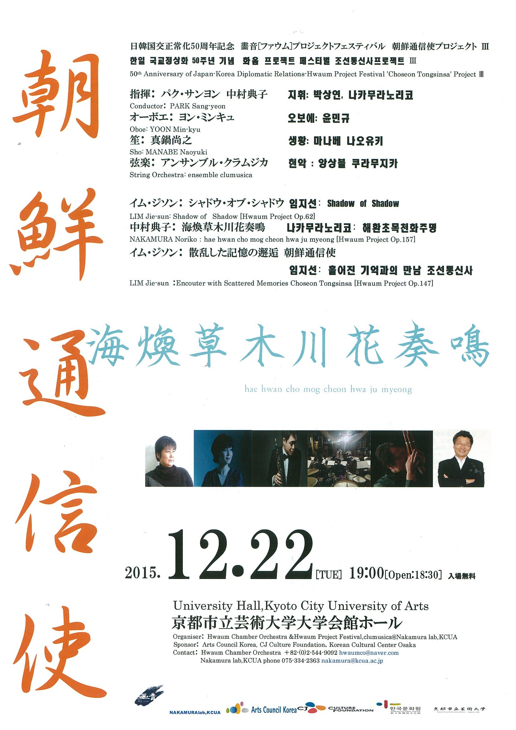 | 主催者 | Hwaum Chamber Orchestra & Hwaum Project Festival, clumusica@Nakamura lab, KCUA | 期間 | 2015-12-22 ~ 2015-12-22 | |
