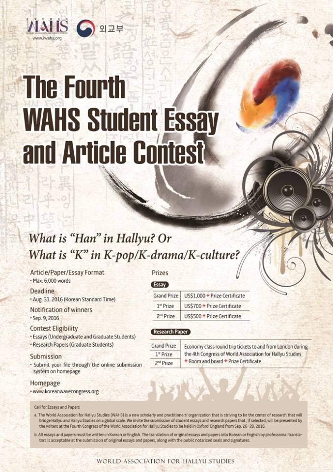 世界韓流学会が主催する「2016 エッセー・論文、映像コンテスト」をご存知でしょうか?8月まで応募受付中です。韓流に興味がある方、K-POPやK-ドラマ、K-カルチャーに関しては誰よりもよく知っている、そんな方は、ぜひご応募下さい。