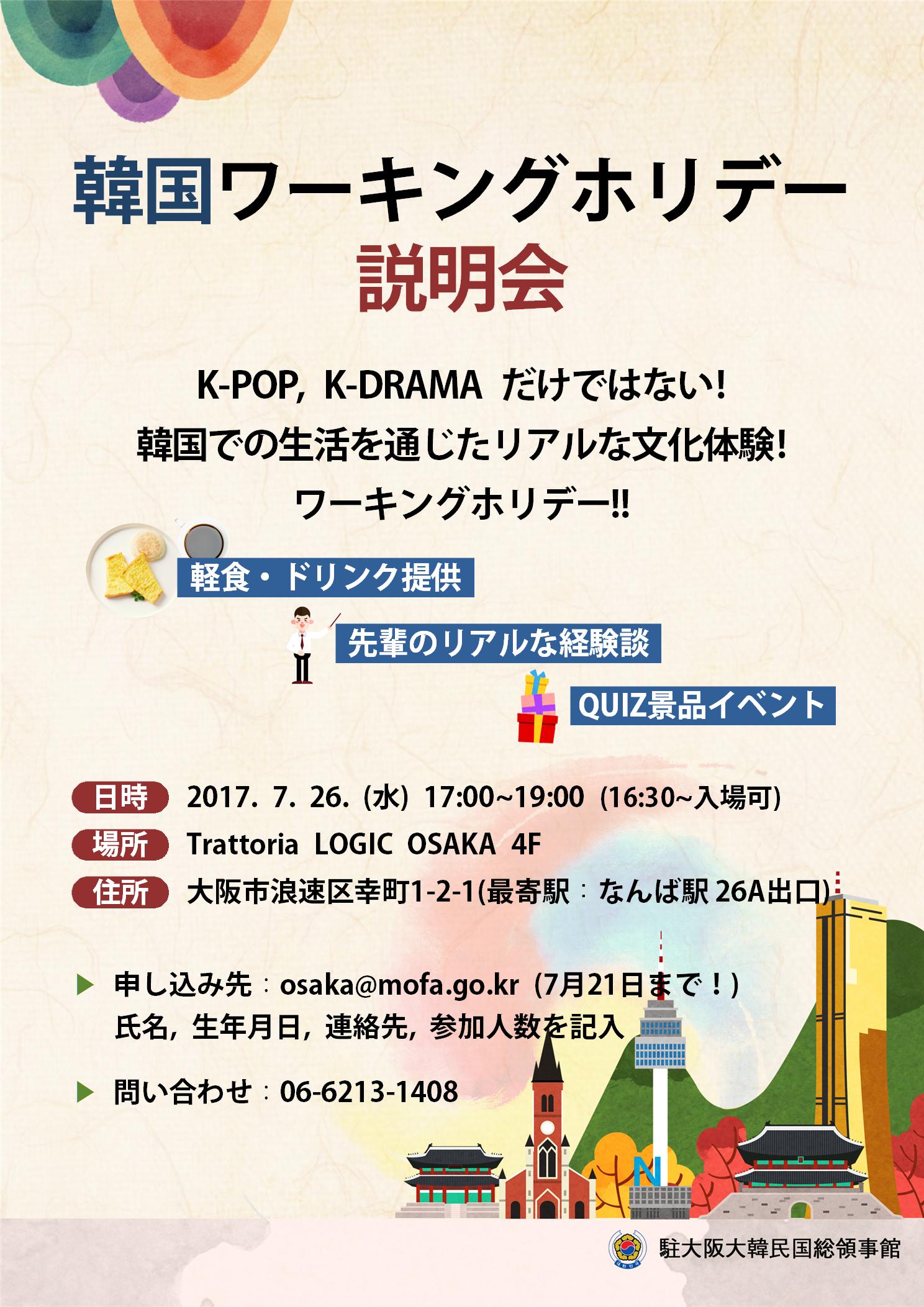 駐大阪大韓民国総領事館は来る7月26日(水)、韓国でのワーキングホリデーに関心のある日本人の方々を対象に「韓国ワーキングホリデー説明会」を開催致します。
