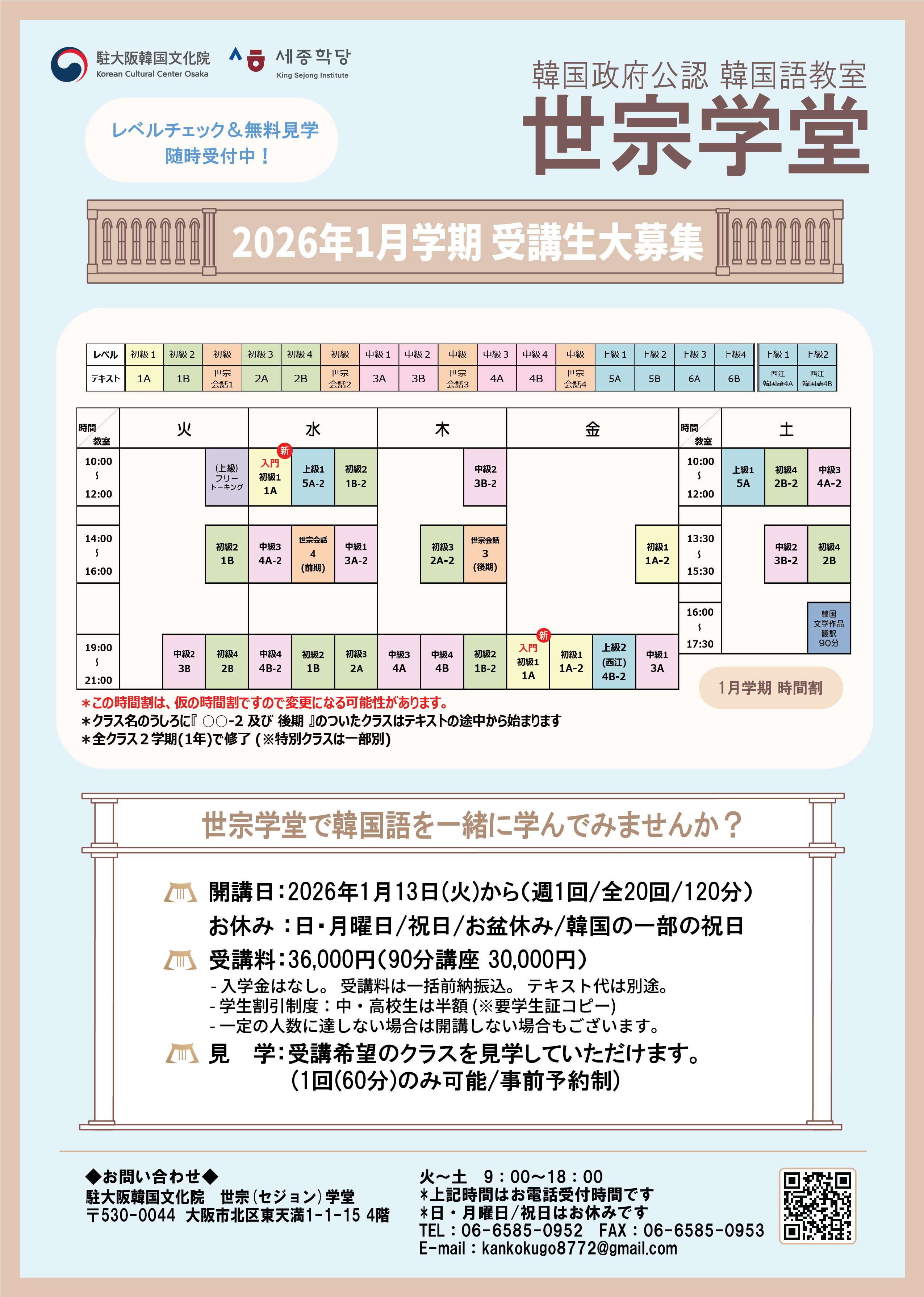 大阪韓国文化院と併設している「世宗学堂」では、2026年1月学期の新規受講者を募集しております。韓国語を初めて学ぶ方向けの「入門クラス」から「韓国文学翻訳クラス」まで!ご自身のレベルに合わせてクラスを選択していただけます。