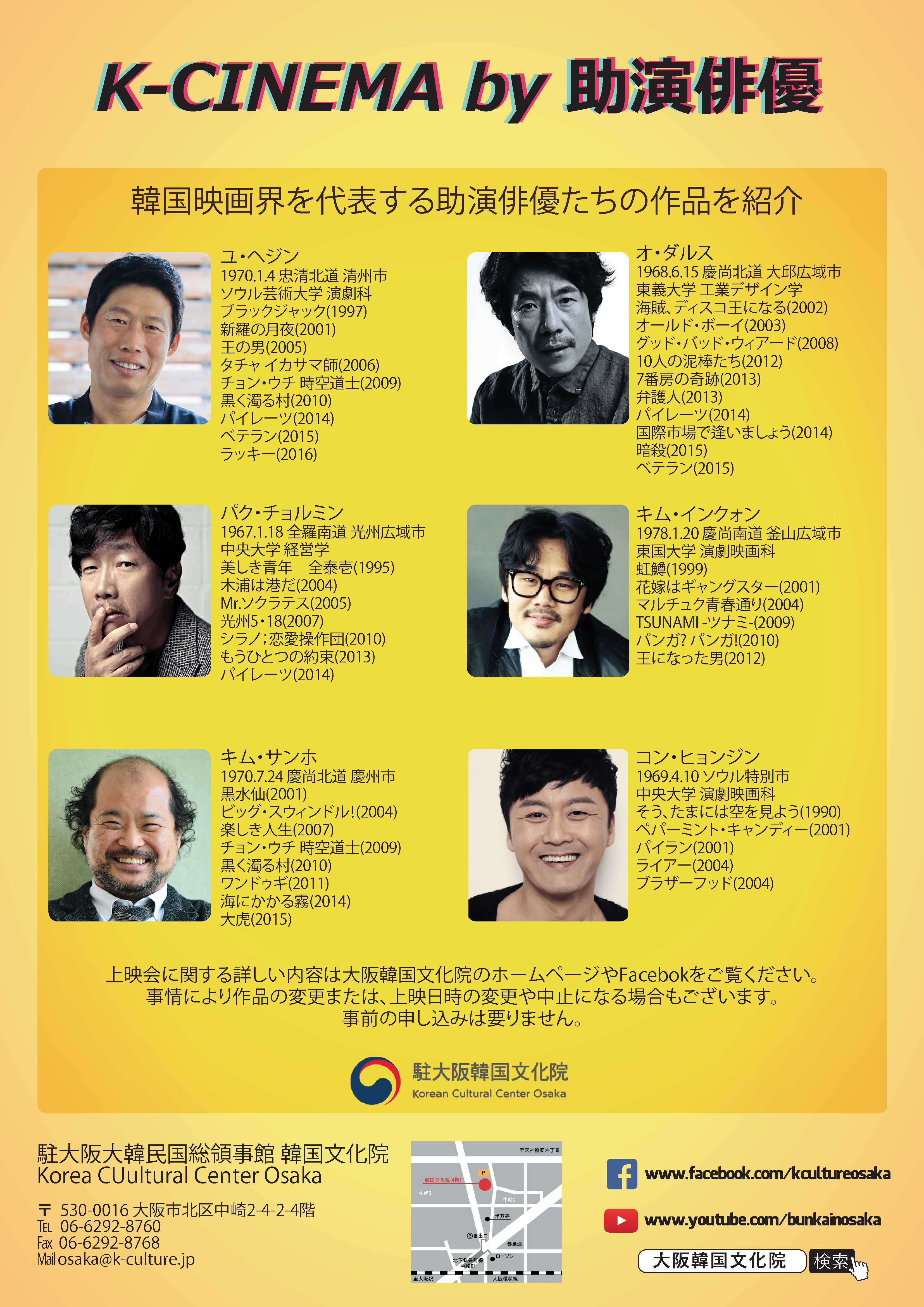 大阪韓国文化院が実施している「韓国映画定期上映会」は、毎年様々なテーマに沿った韓国映画を上映しています。2017年は「K-CINEMA by 助演俳優」というテーマで上映会を開催し、大阪や西日本地域の皆さんに韓国映画の魅力をお伝えします。「K-CINEMA by 助演俳優」は、スクリーンの中で主人公に負けず劣らず輝き観客を魅了する、韓国映画界を代表する助演俳優たちの出演作の中から選りすぐりの作品を紹介する時間です。話題の映画、優れた映画には必ず登場する、韓国映画に欠かすことの出来ない個性的な助演俳優たちの作品を鑑賞し、韓国映画の力を感じてみてください。