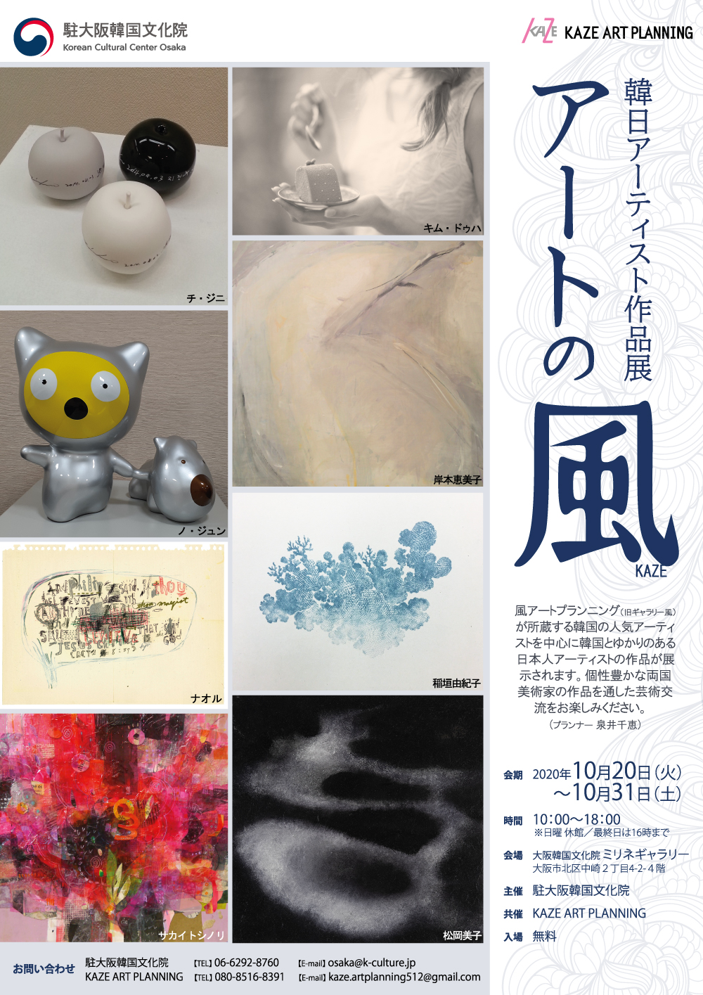 大阪韓国文化院ミリネギャラリーにて、韓国人アーティストと日本人アーティストの作品展、「アートの風」を開催します。
