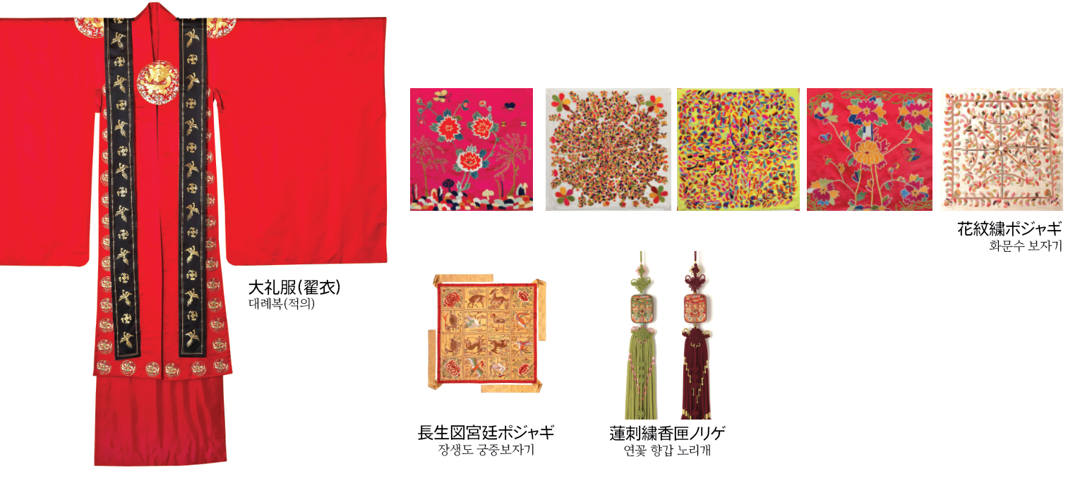 そして、この度の展示では、その名人の手から誕生した宮廷の花嫁衣裳、龍補、ポジャギ、ノリゲなど麗しの宮廷刺繍作品と共に、花柄刺繍ポジャギ、刺繍屏風など様々な作品が展示されます。