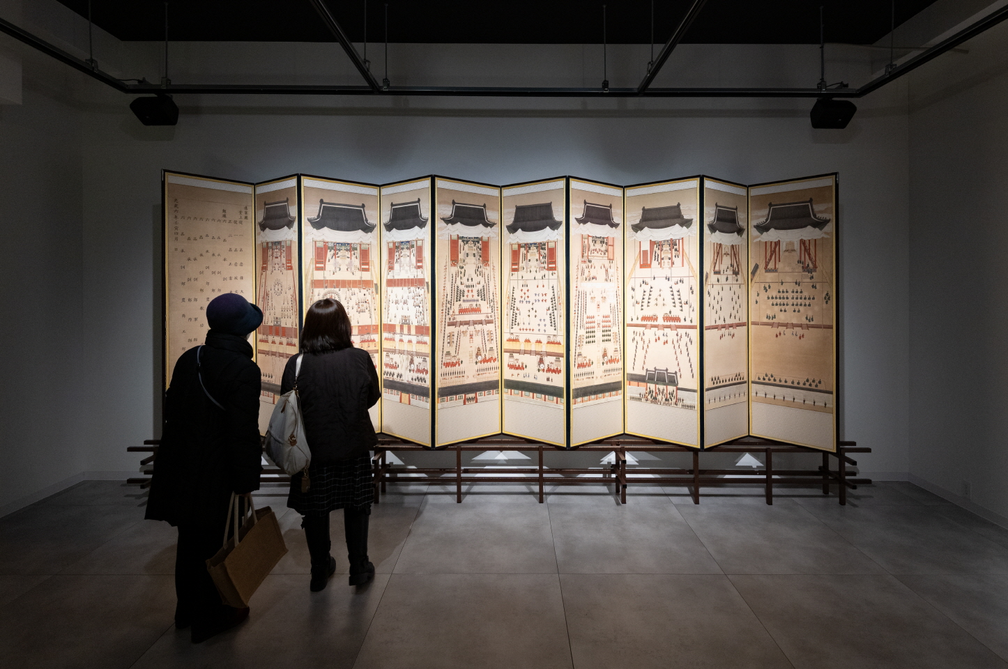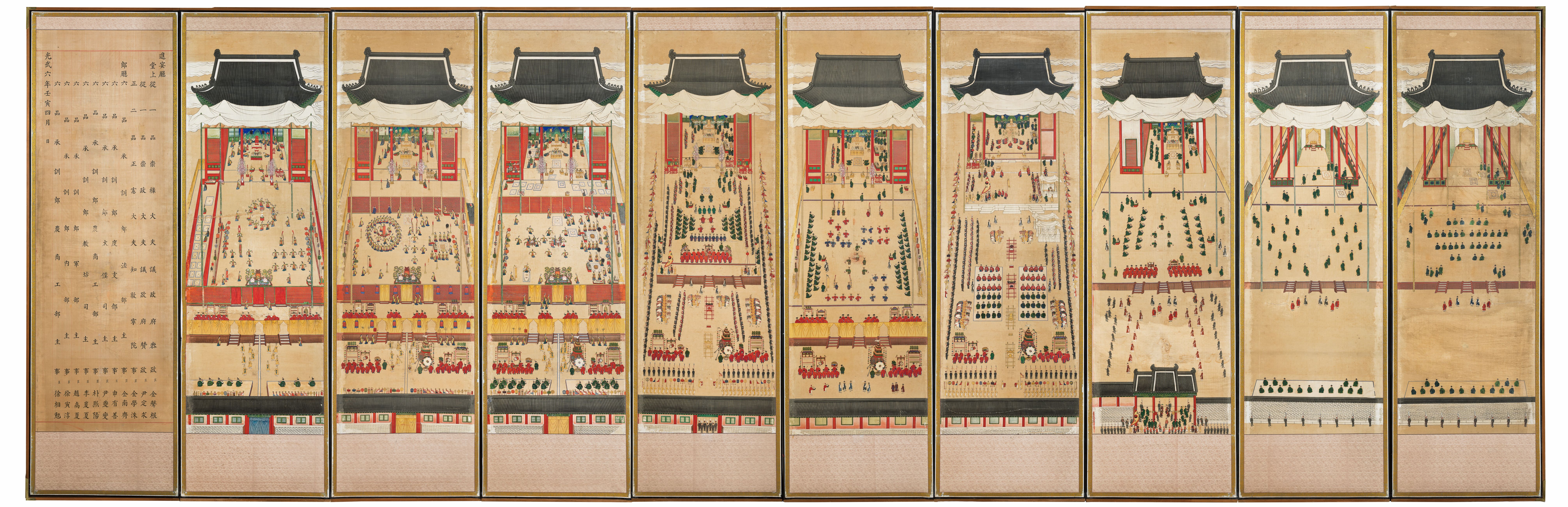 十幅の屏風には高宗が耆老所に入所する様子や臣下たちを中心に開かれる「外進宴」、王家を中心に開かれる「内進宴」の様子などが込められています。