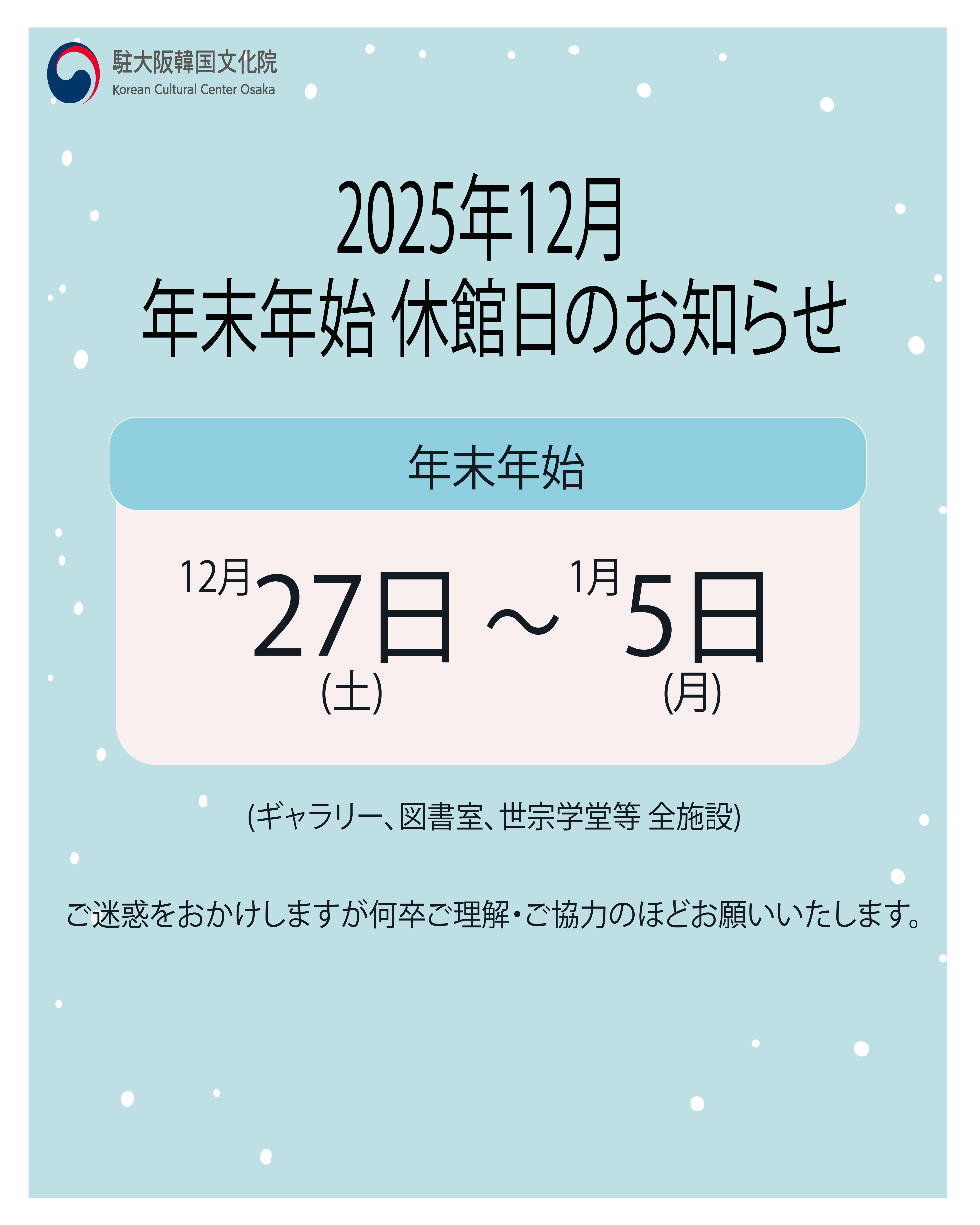 大阪韓国文化院は、2025年~2026年の年末年始に下記の通り休館とさせていただきます。