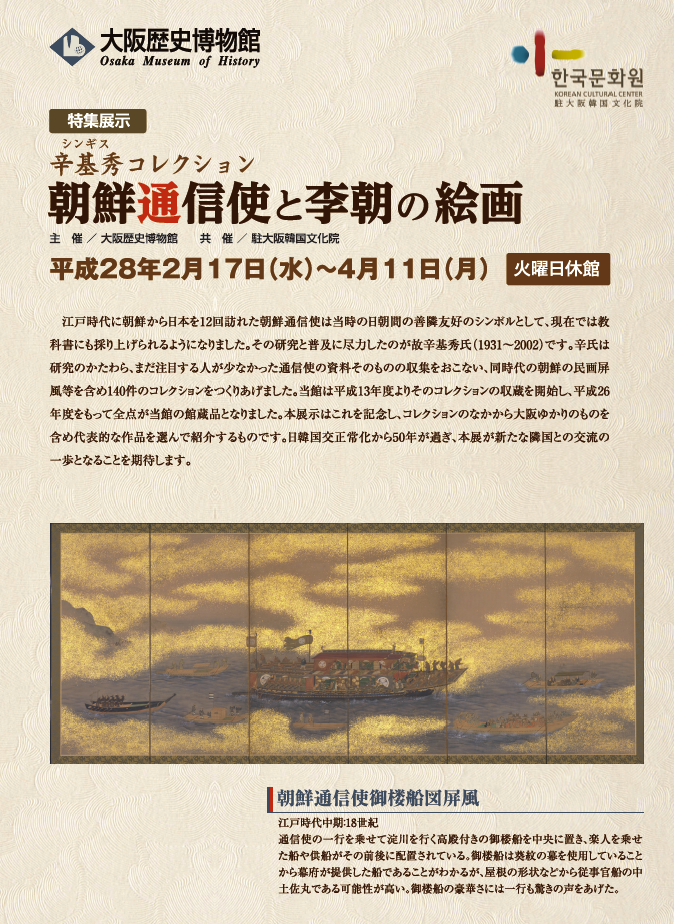 大阪歴史博物館において、2月17日(水)から4月11日(月)まで、特集展示「辛基秀コレクション 朝鮮通信使と李朝の絵画」が、大阪韓国文化院の共催により開催されます。
