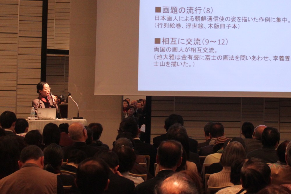 そして、「朝鮮通信使と文化交流」についてお話しをされた片山真理子元高麗美術館研究員からは、朝鮮通信使が回を重ねるごとに文化交流が盛んになっていた様子が紹介されました。通信使に同行した画家 金明国の絵に日本の儒学者 林羅山が画賛をほどこしたことや、対馬までしか行かず富士山を見ていない画家 李義養が日本の画家 谷文晁の描く富士山を参考にした逸話など、当時の交流の様子が美しい絵と共に紹介されました。