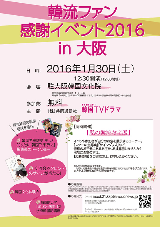 인기 한류지 「좀 더 알고싶다! 한국TV드라마」(주식회사공동통신사)의 창간 70호 발매를 기념하여, 1월 30일 (토) 오사카시 내에서 무료 이벤트 「한류팬 감사 이벤트 2016 in 오사카」가 개최하게 되었습니다!