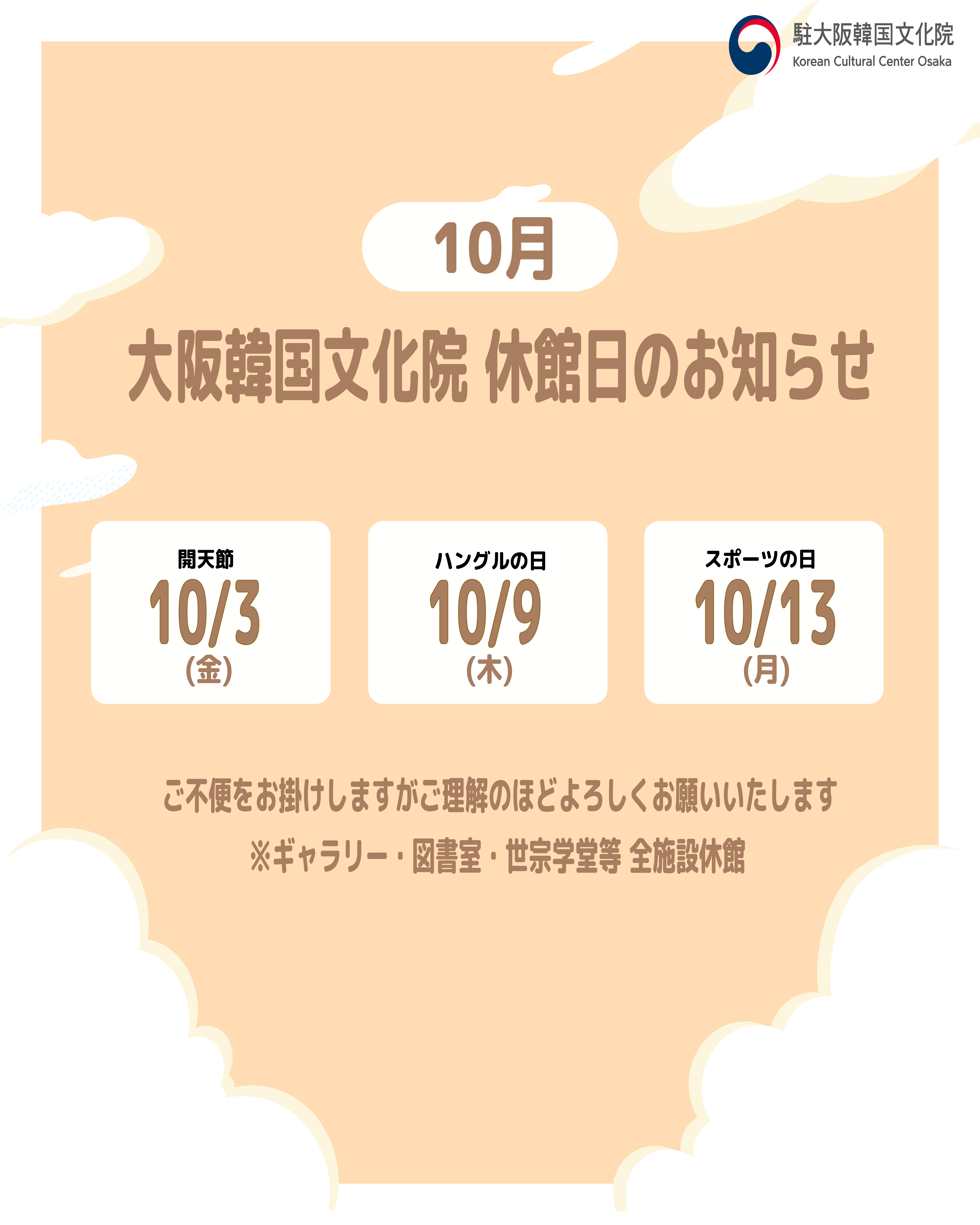■휴관: 주오사카한국문화원 전 시설 (도서실, 갤러리 등)